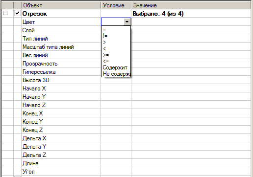"Условие" - назначается оператор сравнения для параметров объектов. У каждого типа объектов есть свои параметры, на которые выставляются условия.