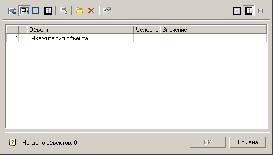 Диалоговое окно состоит из панели инструментов и списка условий поиска. Слева внизу диалога отображается количество найденных объектов согласно заданным условиям поиска.