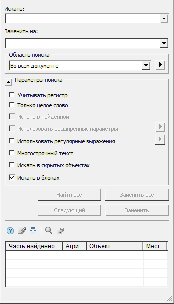 Кнопка "Заменить" запускает процесс последовательной замены найденных фрагментов. Для замены всех найденных фрагментов необходимо каждый раз нажимать кнопку "Заменить", при этом активная строка будет перемещаться по таблице ниже. Кнопка "Следующий" позволяет перемещать активную строку по таблице, пропуская очередной найденный фрагмент в списке без замены его новым значением.